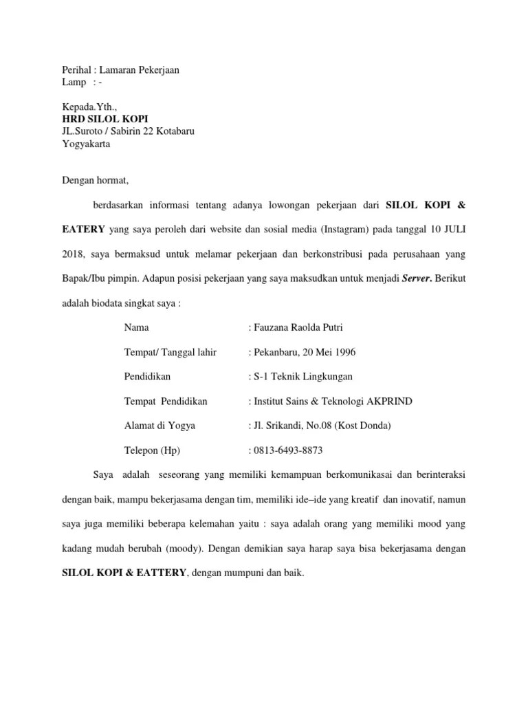 Surat lamaran kerja barista hampir sama dengan menulis lamaran kerja di perusahaan yang lainnya karena sistem kerja di kedai kopi juga . Kumpulan gambar tentang contoh surat lamaran kerja di kedai kopi, klik untuk melihat koleksi gambar lain di kibrispdr.org. Saya ingin mengajukan pengunduran diri saya sebagai waiter (pelayan) di kedai kopi mlintir. Besar harapan saya untuk dapat . Di indonesia, kedai starbucks dikelola oleh pt. Simak tips dan trik menulisnya di glints! Foto kopi surat keterangan catatan kriminal (skck). Kedai kopi ✓ cari di antara 22.000+ lowongan kerja terbaru di indonesia. Demikian suar lamaran pekerjaan yang telah saya buat. Foto kopi surat keterangan catatan kriminal (skck). Contoh surat lamaran kerja di kedai kopi yang benar dan tepat · pas foto ukuran 3×4 1 lembar · fotocopy ijazah 1 lembar · foto copy ktp 1 lembar . Beikut ini artikel tentang contoh surat lamaran kerja untuk anda yang mau melamar pekerjaan, silahkan contoh dan edit artikel tersebut. Berikut contoh surat lamaran kerja untuk fresh graduate setingkat sma dan smk yang baik.